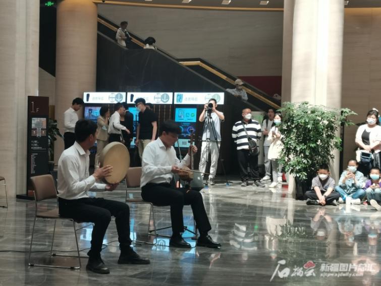 “我和我的祖国,一刻也不能分割……”《我和我的祖国》熟悉的旋律响起,6位身着白衬衣、黑裤子的青年弹奏着热瓦普,走到新疆博物馆一楼大厅中央。数百位现场观众被美妙的乐曲吸引,纷纷停下脚步,围拢起来,欣赏这场不期而遇的音乐会。