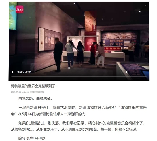 5月18日,石榴云/新疆日报原创以《博物馆里的音乐会完整版到了!》为题对我校进行报道。