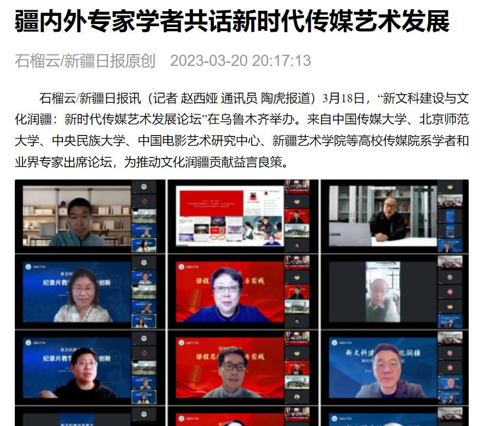 3月20日,石榴云/新疆日报原创以《疆内外专家学者共话新时代传媒艺术发展》为题对我校进行报道。