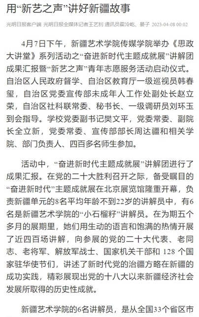 4月8日,光明日报以《用“新艺之声”讲好新疆故事》为题对我校进行报道。