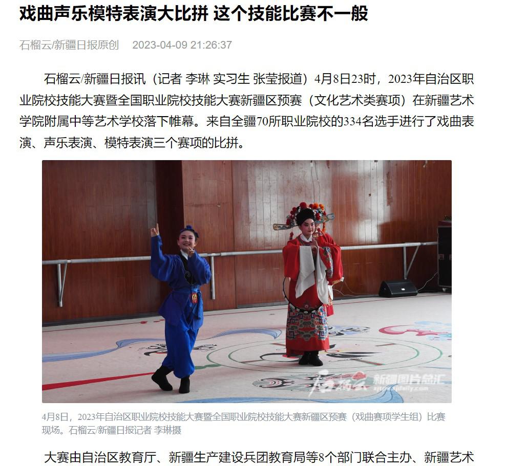 4月9日,石榴云/新疆日报原创以《戏曲声乐模特表演大比拼 这个技能比赛不一般》为题对我校进行报道。