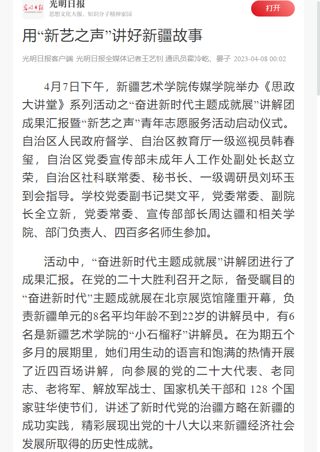 4月8日,光明日报以《用“新艺之声”讲好新疆故事》为题对我校进行报道。