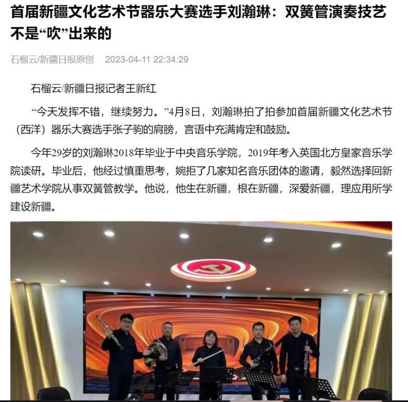 4月11日,石榴云/新疆日报原创以《首届新疆文化艺术节器乐大赛选手刘瀚琳:双簧管演奏技艺不是“吹”出来的》为题对我校进行报道。