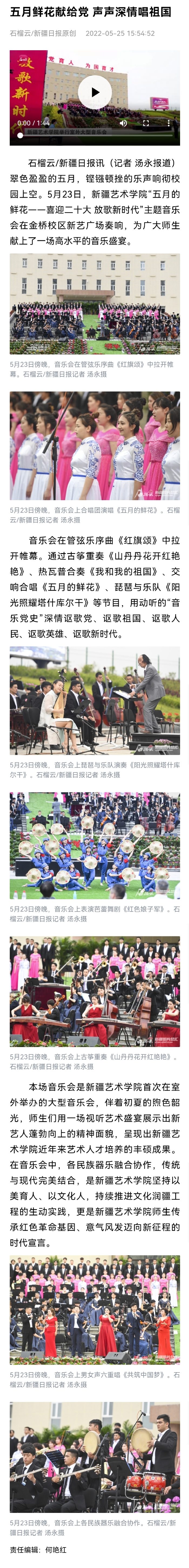 5月23日,《石榴云、新疆日报》以《五月鲜花献给党 声声深情唱祖国》为题,对我校举办“五月的鲜花——喜迎二十大 放歌新时代”主题音乐会情况进行了报道。