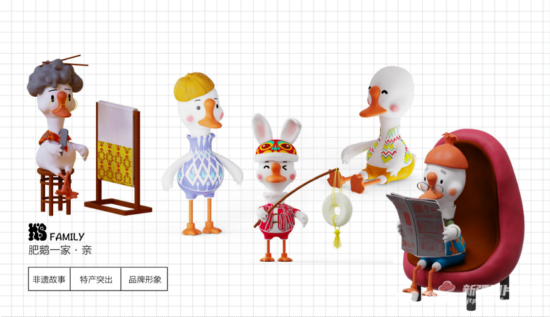 鹅养殖业是和田县的优势产业。记者看到,在IP盲盒-肥鹅一家亲系列文创中,设计团队将鹅作为IP形象的主体进行设计,融入了红枣、核桃、石榴、玉石、地毯和艾德莱斯纹样等和田特色文化符号,并以“鹅子娃娃”等新疆方言进行谐音转换命名,“肥鹅一家”色彩明亮、憨态可掬,充满了时代感、趣味性和地方特色。