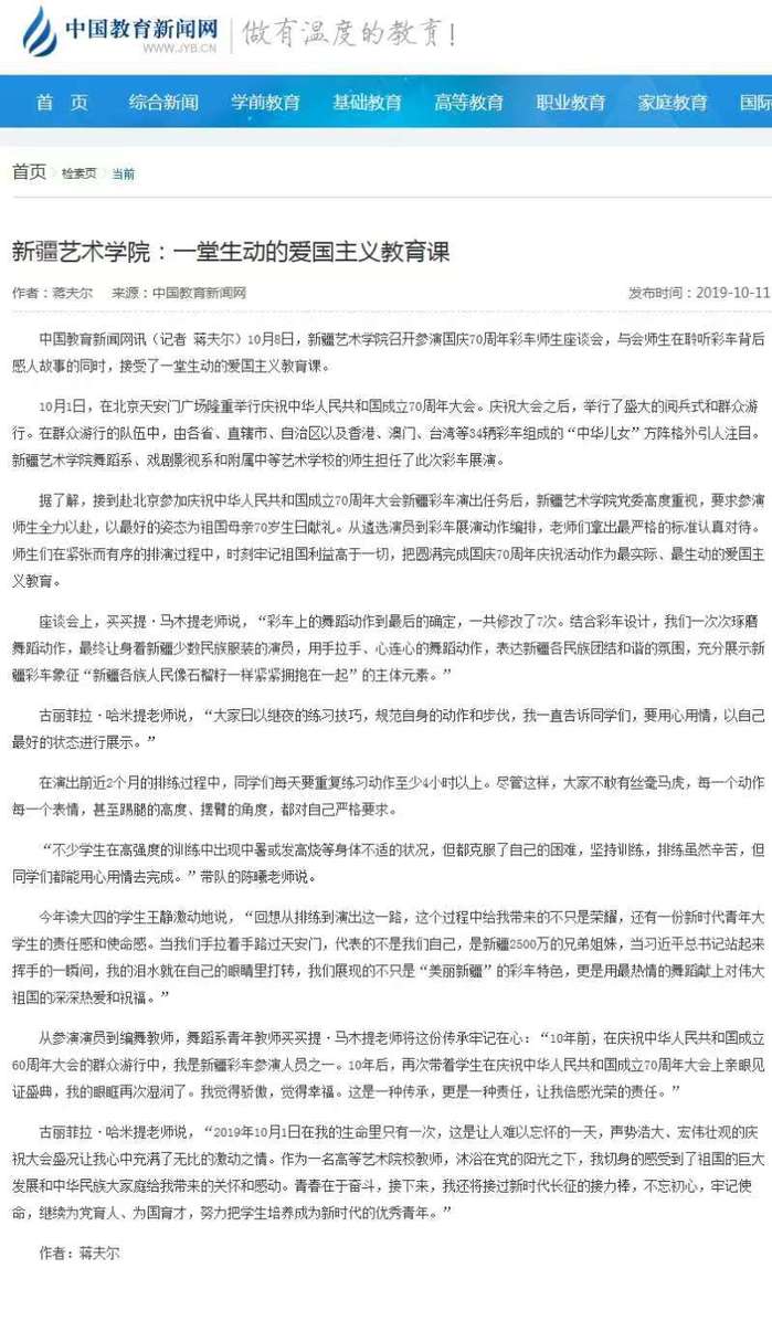 10月11日,【中国教育新闻网】在以《新疆艺术学院︰一堂生动的爱国主义教育课》为题,对我校师生参加庆祝中华人民共和国成立70周年大会彩车展演情况进行了报道。
