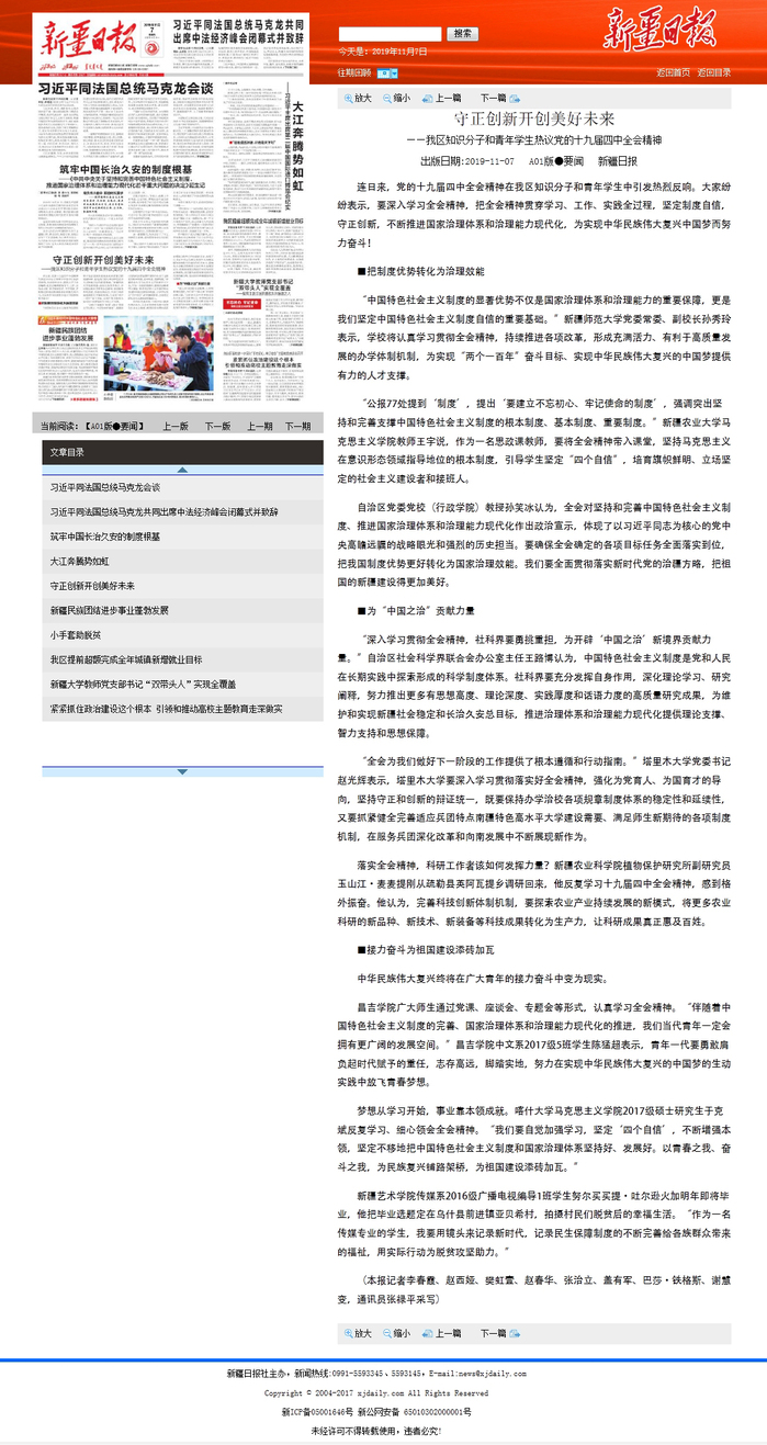 11月7日,《新疆日报》在A01版·要闻中以《守正创新开创美好未来——我区知识分子和青年学生热议党的十九届四中全会精神》为题,对我校学生深入学习全会精神进行了报道。以下是报道节选。