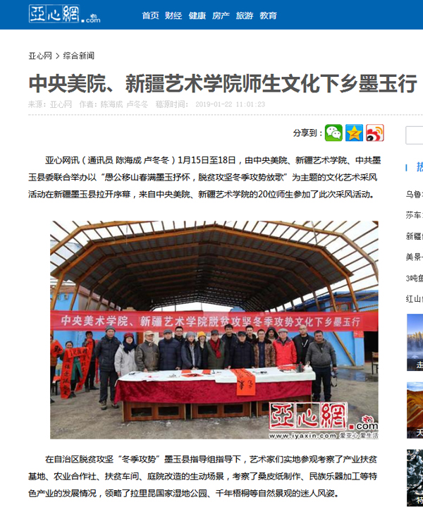 【新闻报道】亚心网讯(通讯员 陈海成 卢冬冬)1月15日至18日,由中央美院、新疆艺术学院、中共墨玉县委联合举办以“愚公移山春满墨玉抒怀,脱贫攻坚冬季攻势放歌”为主题的文化艺术采风活动在新疆墨玉县拉开序幕,来自中央美院、新疆艺术学院的20位师生参加了此次采风活动。