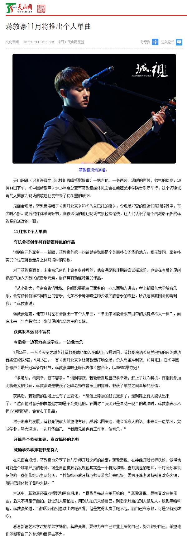 【新闻报道】天山网讯(记者许释文 金佐坤 郭峰摄影报道)一把吉他,一身西装,温暖的声线,帅气的脸庞。10月14日下午,《中国新歌声》2016年度总冠军蒋敦豪媒体见面会在新疆艺术学院音乐厅举行,这个沉稳低调的大男孩为现场的歌迷朋友带来了初冬里的暖阳。