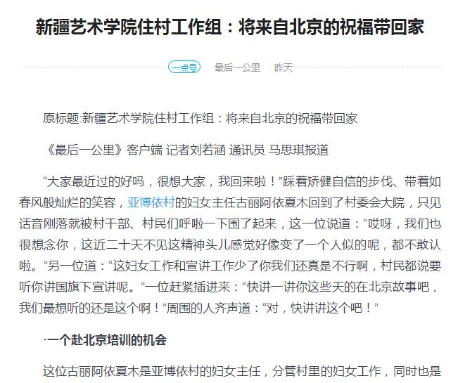 “大家最近过的好吗,很想大家,我回来啦!”踩着矫健自信的步伐、带着如春风般灿烂的笑容,亚博依村的妇女主任古丽阿依夏木回到了村委会大院,只见话音刚落就被村干部、村民们呼啦一下围了起来,这一位说道:“哎呀,我们也很想念你,这近二十天不见这精神头儿感觉好像变了一个人似的呢,都不敢认啦。”另一位道:“这妇女工作和宣讲工作少了你我们还真是不行啊,村民都说要听你讲国旗下宣讲呢。”一位赶紧插进来:“快讲一讲你这些天的在北京故事吧,我们最想听的还是这个啊!”周围的人齐声道:“对,快讲讲这个吧!