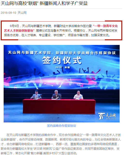 【新闻报道】9月9日,天山网与新疆艺术学院、新疆财经大学战略合作签约暨“一带一路青年文化艺术人才创业创新基地”揭牌仪式在乌鲁木齐市举行。根据协议,天山网与两所高校将发挥各方优势,在人才培养、专业建设、学校推广、项目合作等方面,加强深度交流。