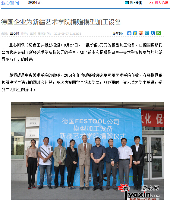 【新闻报道】亚心网讯(记者王渊摄影报道)9月27日,一批价值5万元的模型加工设备,由德国费斯托公司代表交到了新疆艺术学院校领导的手中,据了解本次捐赠是由中央美术学院援疆教师郝凝辉多方奔走的结果。