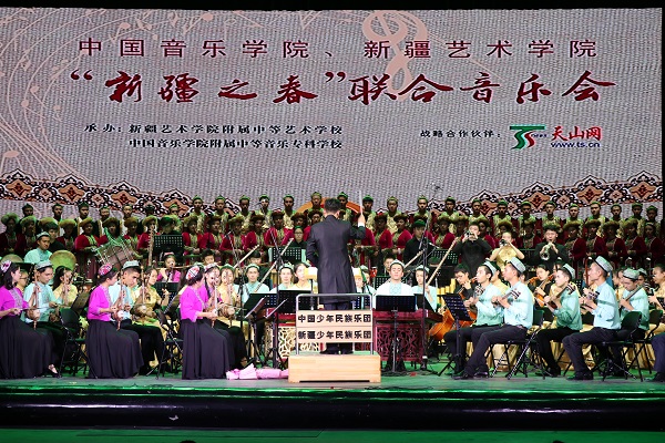音乐会上,两所学院附中的孩子们手拉手、同学习、展技艺,为观众们带来了《我们新疆好地方》、《阳光照耀着塔什库尔干》、《心中的麦西莱甫》等众多耳熟能详的曲目。