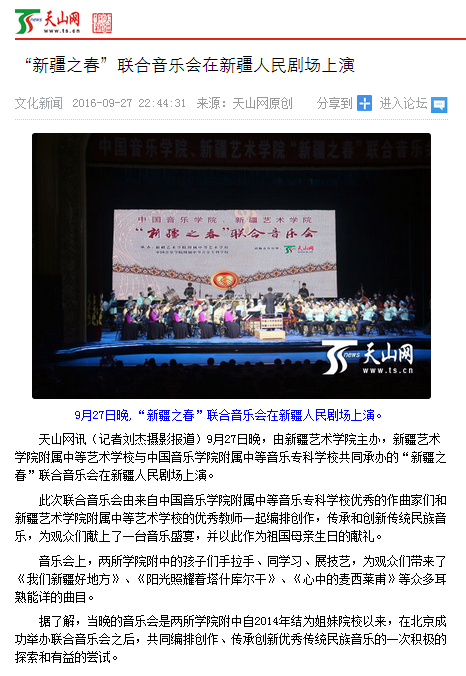 天山网讯(记者刘杰摄影报道)9月27日晚,由新疆艺术学院主办,新疆艺术学院附属中等艺术学校与中国音乐学院附属中等音乐专科学校共同承办的“新疆之春”联合音乐会在新疆人民剧场上演。