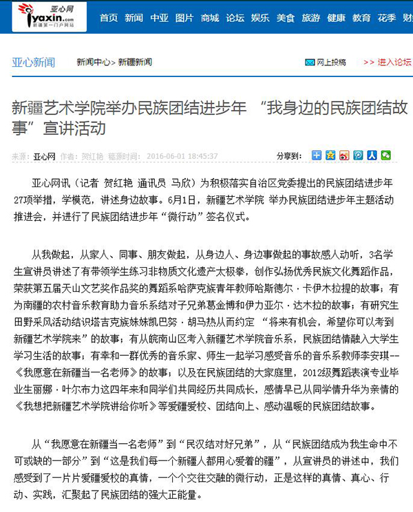 【新闻报道】亚心网讯(记者 贺红艳 通讯员 马欣)为积极落实自治区党委提出的民族团结进步年27项举措,学模范,讲述身边故事。6月1日,新疆艺术学院 举办民族团结进步年主题活动推进会,并进行了民族团结进步年“微行动”签名仪式。