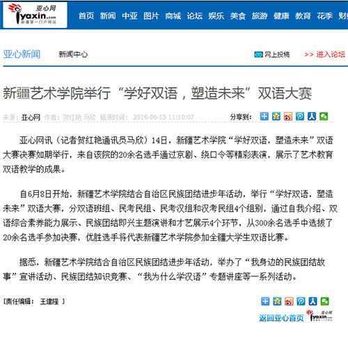 【新闻报道】亚心网讯(记者贺红艳通讯员马欣)14日,新疆艺术学院“学好双语,塑造未来”双语大赛决赛如期举行,来自该院的20余名选手通过京剧、绕口令等精彩表演,展示了艺术教育双语教学的成果。