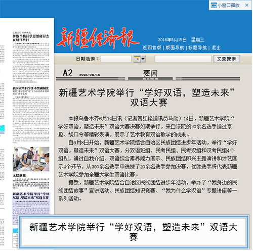 【新闻报道】本报乌鲁木齐6月14日讯(记者贺红艳通讯员马欣)14日,新疆艺术学院“学好双语,塑造未来”双语大赛决赛如期举行,来自该院的20余名选手通过京剧、绕口令等精彩表演,展示了艺术教育双语教学的成果。