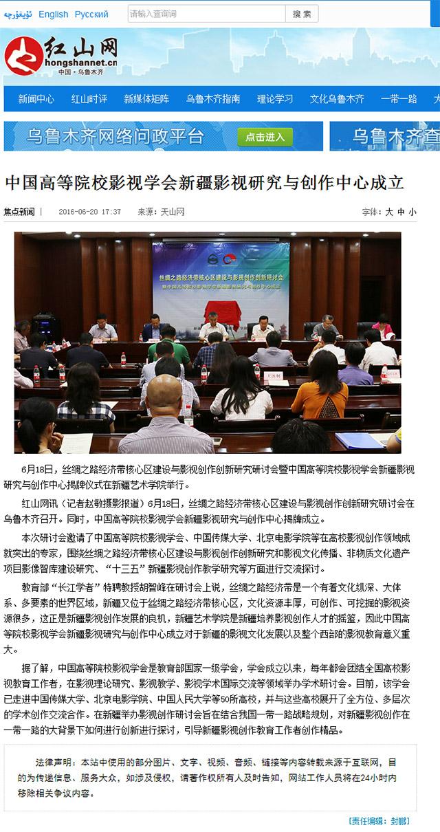 【新闻报道】红山网讯(记者赵敏摄影报道)6月18日,丝绸之路经济带核心区建设与影视创作创新研究研讨会在乌鲁木齐召开。同时,中国高等院校影视学会新疆影视研究与创作中心揭牌成立。