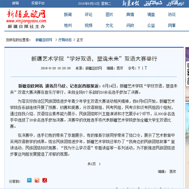【新闻报道】新疆亚欧网讯 通讯员马欣、记者赵西娅报道:6月14日,新疆艺术学院“学好双语,塑造未来”双语大赛决赛在音乐厅举行,来自全院6个系部的20余名选手参加了决赛。