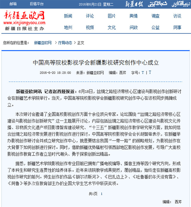 【新闻报道】新疆亚欧网讯 记者赵西娅报道:6月18日,丝绸之路经济带核心区建设与影视创作创新研讨会在新疆艺术学院举行。当天,中国高等院校影视学会新疆影视研究创作中心在该校同步揭牌成立。