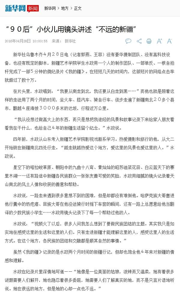 【新闻报道】新华社乌鲁木齐4月28日电(记者郭燕、王菲)没有豪华摄制团队、没有高科技设备,也没有既定的脚本,新疆艺术学院学生水政用一个人的制作团队、一部单反、一根自拍杆完成了一部5分钟的微纪录片《我的疆》。在短短几天的时间内,这部短片的网络点击率就超过了数十万。