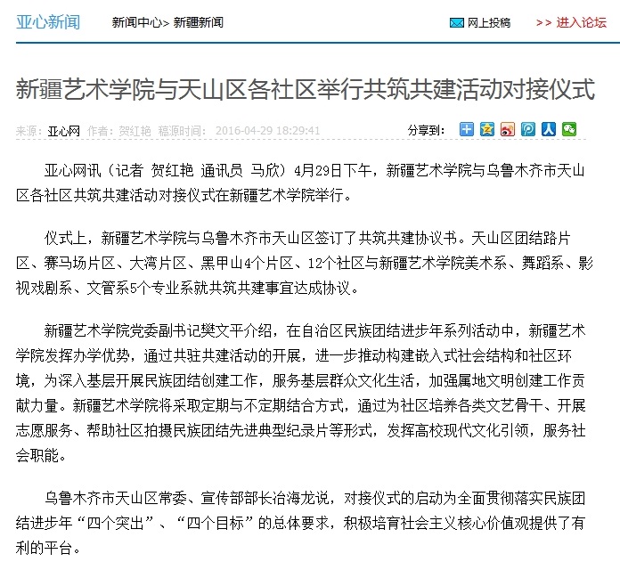 【新闻报道】亚心网讯(记者 贺红艳 通讯员 马欣) 4月29日下午,新疆艺术学院与乌鲁木齐市天山区各社区共筑共建活动对接仪式在新疆艺术学院举行。