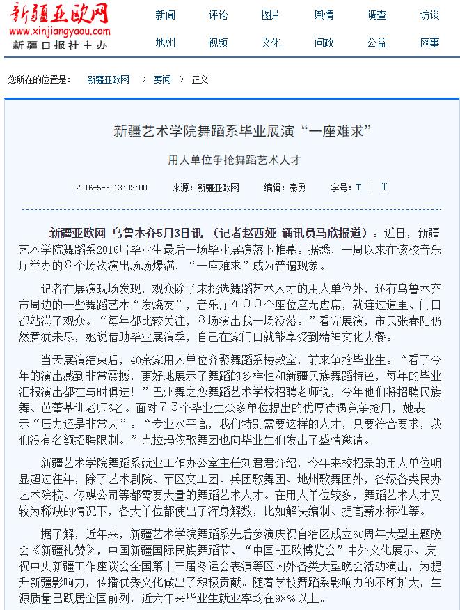 据了解,近年来,新疆艺术学院舞蹈系先后参演庆祝自治区成立60周年大型主题晚会《新疆礼赞》,中国新疆国际民族舞蹈节、“中国-亚欧博览会”中外文化展示、庆祝中央新疆工作座谈会全国第十三届冬运会表演等区内外各类大型晚会活动演出,为提升新疆影响力,传播优秀文化做出了积极贡献。随着学校舞蹈系影响力的不断扩大,生源质量已跃居全国前列,近六年来毕业生就业率均在98℅以上。