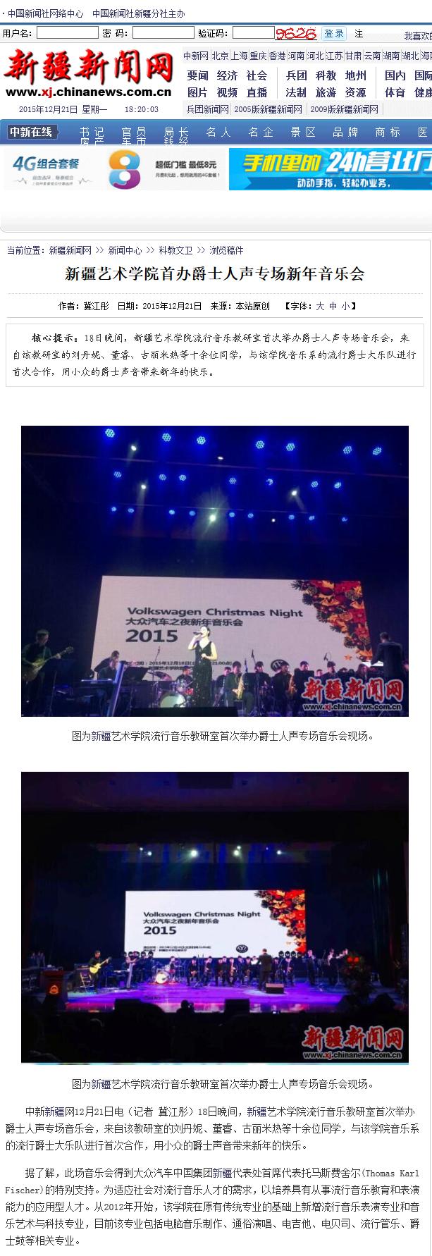 【新闻报道】中新新疆网12月21日电(记者 冀江彤)18日晚间,新疆艺术学院流行音乐教研室首次举办爵士人声专场音乐会,来自该教研室的刘丹妮、董睿、古丽米热等十余位同学,与该学院音乐系的流行爵士大乐队进行首次合作,用小众的爵士声音带来新年的快乐。