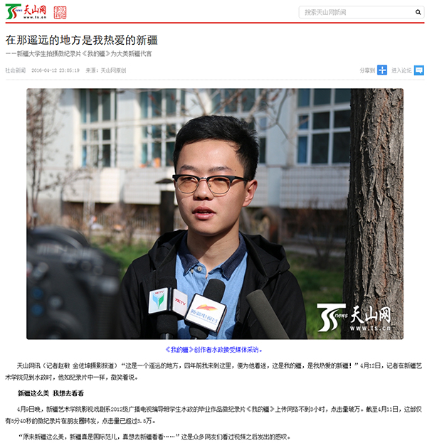 4月9日晚,新疆艺术学院影视戏剧系2012级广播电视编导班学生水政的毕业作品微纪录片《我的疆》上传网络不到3小时,点击量破万。截至4月11日,这部仅有5分40秒的微纪录片在朋友圈转发,点击量已超过3.5万。