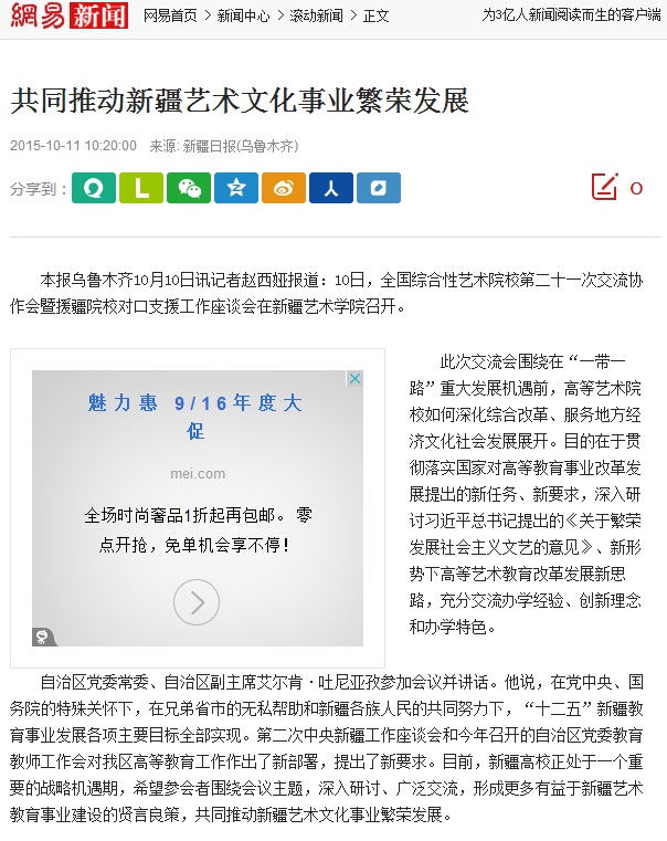 【新闻报道】本报乌鲁木齐10月10日讯记者赵西娅报道:10日,全国综合性艺术院校第二十一次交流协作会暨援疆院校对口支援工作座谈会在新疆艺术学院召开。