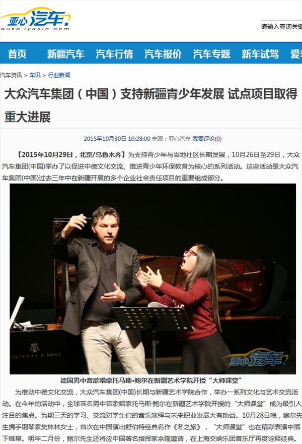 为推动中德文化交流,大众汽车集团(中国)长期与新疆艺术学院合作,举办一系列文化与艺术交流活动。在今年的活动中,全球著名男中音歌唱家托马斯·鲍尔在新疆艺术学院开授的“大师课堂”成为最引人注目的焦点。为期三天的学习、交流对学生们的音乐演绎与未来职业发展大有助益。10月28日晚,鲍尔先生携手钢琴家樊林林女士,首次在中国演出舒伯特经典名作《冬之旅》,“大师课堂”也在精彩表演中落下帷幕。明年二月份,鲍尔先生还将应中国著名指挥家余隆邀请,在上海交响乐团音乐厅再度诠释经典。
