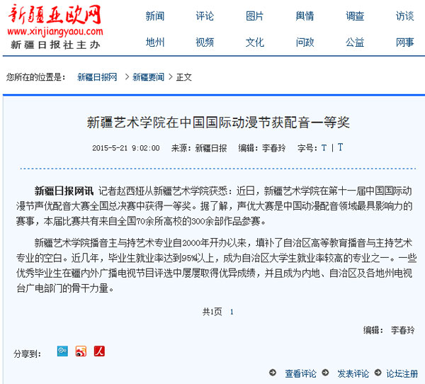 新疆日报网讯 记者赵西娅从新疆艺术学院获悉:近日,新疆艺术学院在第十一届中国国际动漫节声优配音大赛全国总决赛中获得一等奖。据了解,声优大赛是中国动漫配音领域最具影响力的赛事,本届比赛共有来自全国70余所高校的300余部作品参赛。