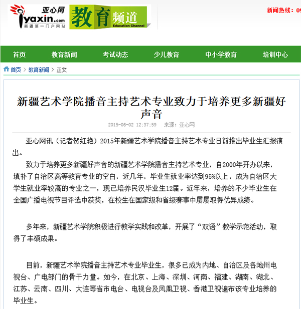 【新闻报道】亚心网讯(记者贺红艳)2015年新疆艺术学院播音主持艺术专业日前推出毕业生汇报演出。