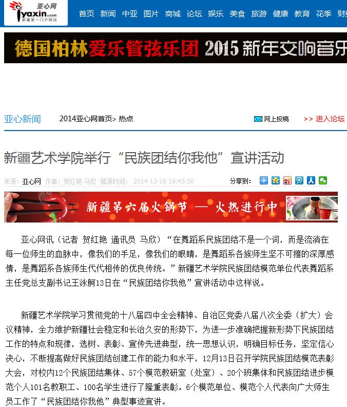 今年,新疆艺术学院结合实际,开展了以民族团结教育为主题的“六个一”活动,一次主题宣讲、一场主题班会、一场民族团结教育影片、一次民族团结联谊活动、一首民族团结歌曲、一次演讲比赛。以反映“民族团结,建设美好新疆”为主题的靓丽工程文艺演出、微电影、纪录片、话剧,从学院附中与中国音乐学院附中举办的联合音乐会,到驻岳普湖县的两个工作组开展的演讲比赛、宣讲、运动会、结对帮扶、大力开展民族团结进步村、做好宗教界“五好”宗教活动场所和“五好”宗教人士等等,这些形式多样、内容丰富的创建活动不仅进一步巩固了学院各族师生和睦相处的良好局面,也为维护自治区社会稳定和长治久安作出了积极的贡献。