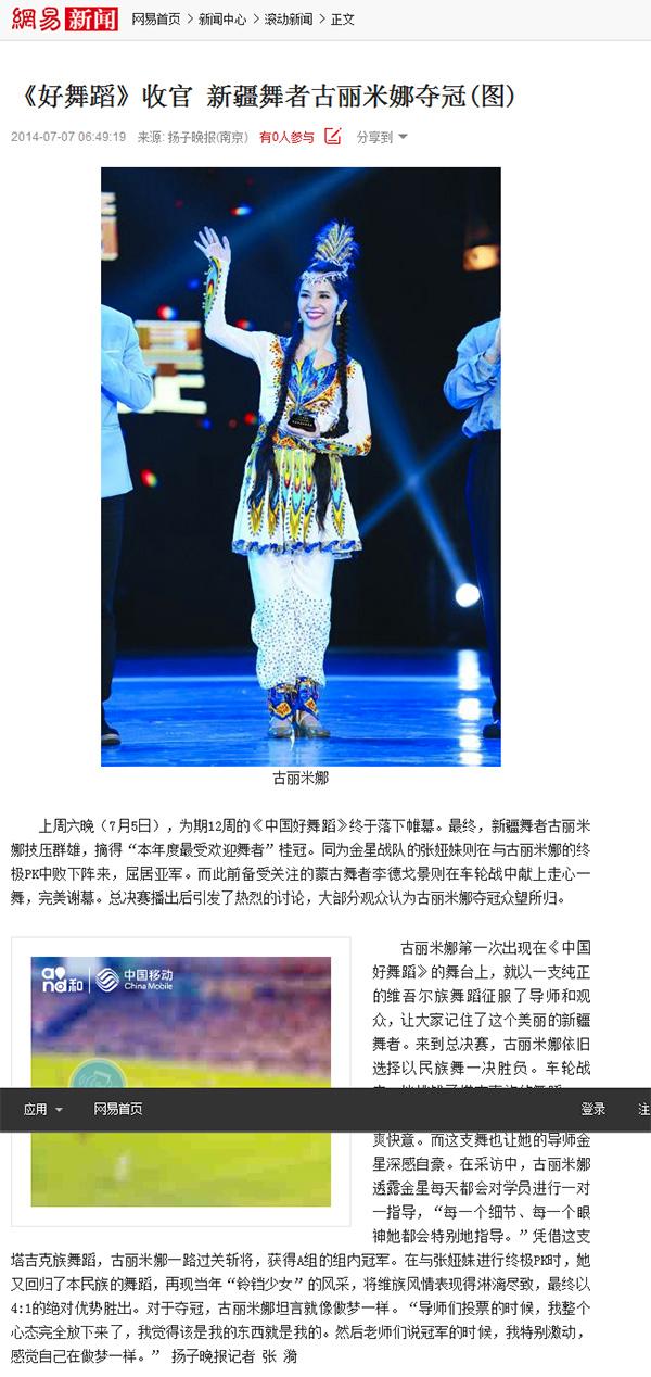 网易网报道新疆舞者古丽米娜《中国好舞蹈》夺冠