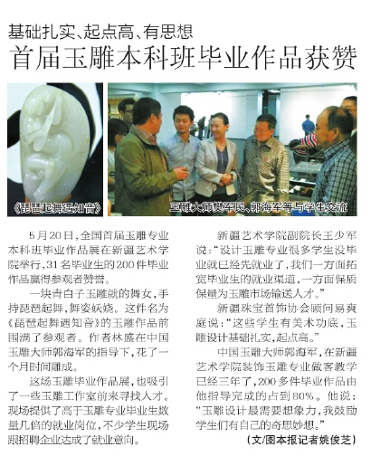 【新闻报道】今年23岁的林和盛来自福建,是新疆艺术学院美术系装饰玉雕专业2010届的毕业生。目前正在中国玉雕大师郭海军处实习。他的同学中也有几人正在实习,就业前景看好。