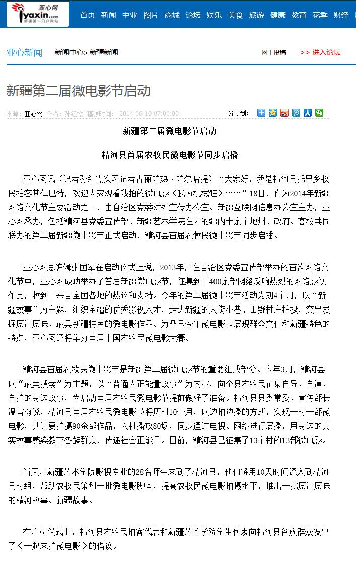 亚心网总编辑张国军在启动仪式上说,2013年,在自治区党委宣传部举办的首次网络文化节中,亚心网成功举办了首届新疆微电影节,征集到了400余部网络反响热烈的网络影视作品,收到了来自全国各地的热议和支持。今年的第二届微电影节活动为期4个月,以“新疆故事”为主题,组织全疆的优秀影视人才,走进新疆的大街小巷、田野村庄拍摄,突出发掘原汁原味、最具新疆特色的微电影作品。为凸显今年微电影节展现群众文化和新疆特色的特点,亚心网还将举办首届中国农牧民微电影大赛。