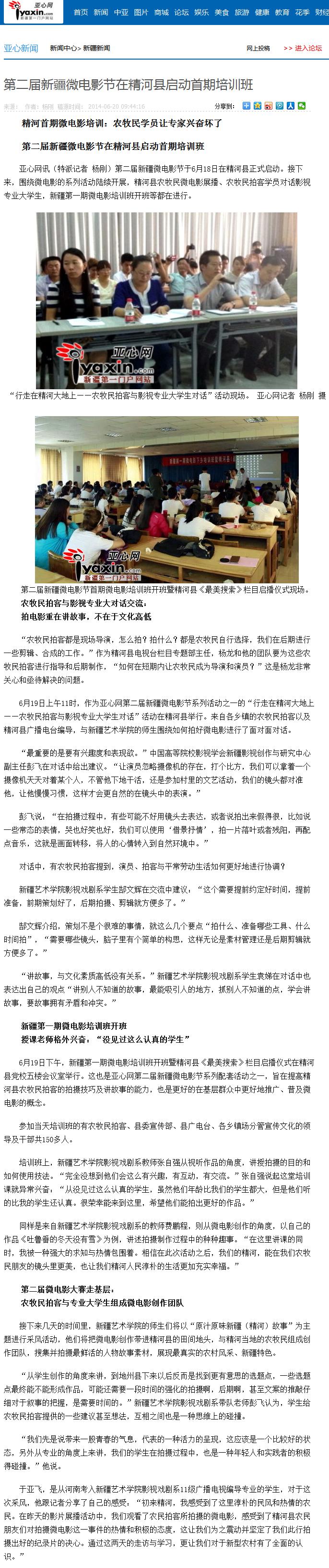 【新闻报道】 亚心网讯(特派记者 杨刚)第二届新疆微电影节于6月18日在精河县正式启动。接下来,围绕微电影的系列活动陆续开展,精河县农牧民微电影展播、农牧民拍客学员对话影视专业大学生,新疆第一期微电影培训班开班等都在进行。