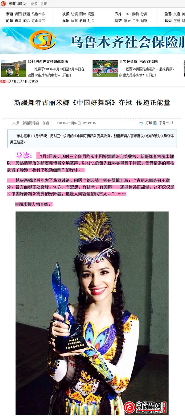 新疆网报道新疆舞者古丽米娜《中国好舞蹈》夺冠