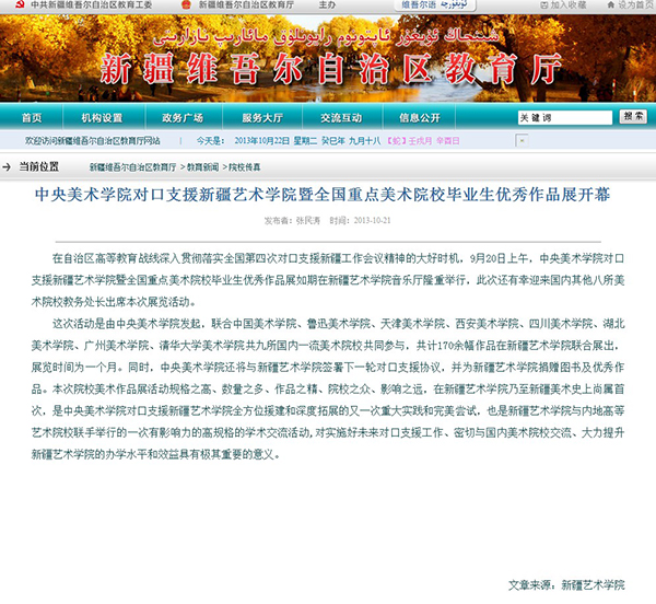 2013年10月21日 新疆教育信息网报道中央美术学院对口支援新疆艺术学院学术交流活动