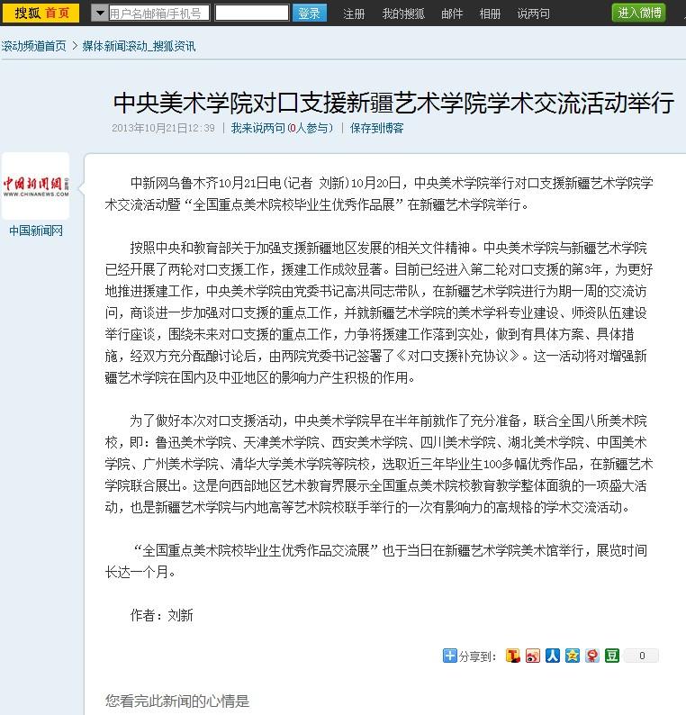 2013年10月21日 搜狐网报道中央美术学院对口支援新疆艺术学院学术交流活动