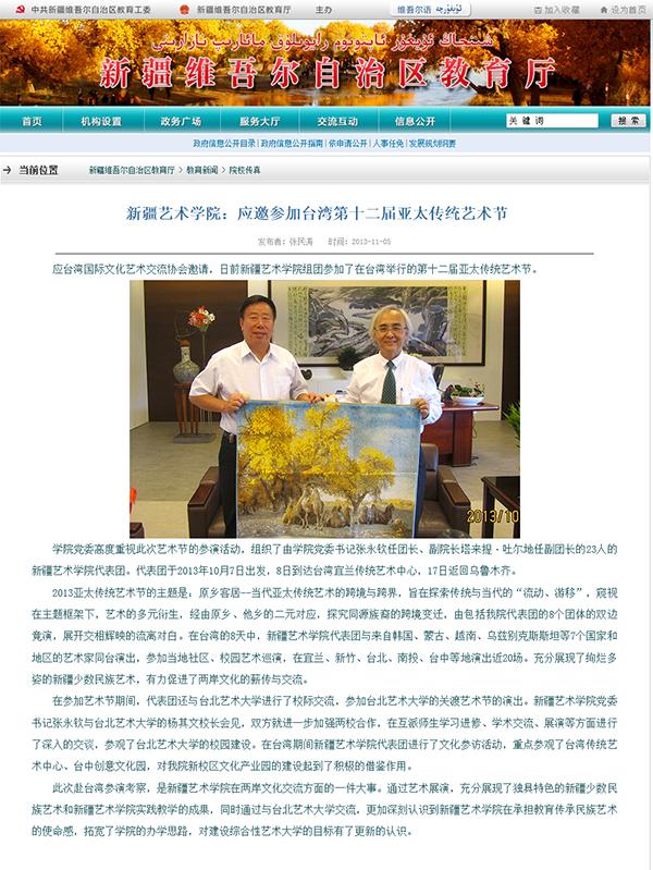 新疆教育信息网报道新疆艺术学院应邀参加台湾第十二届亚太传统艺术节