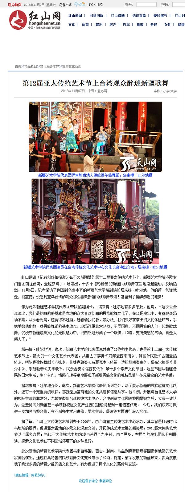 红山网报道新疆艺术学院应邀参加台湾第十二届亚太传统艺术节