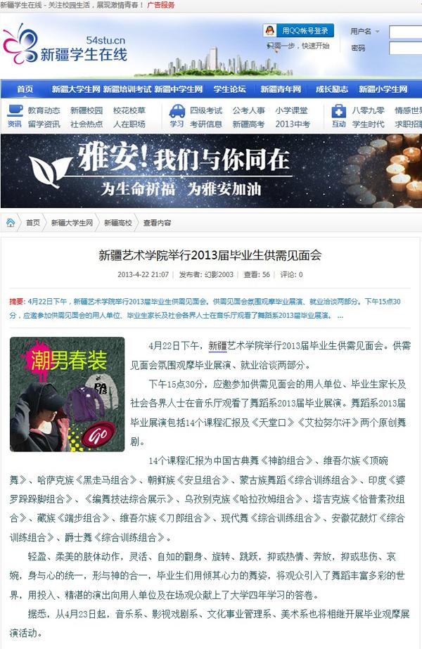 【新闻报道】 4月22日下午,新疆艺术学院举行2013届毕业生供需见面会。供需见面会氛围观摩毕业展演、就业洽谈两部分。