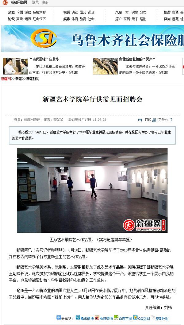 【新闻报道】 新疆网讯(实习记者樊琴琴)5月16日,新疆艺术学院举行了2013届毕业生供需见面招聘会,并在校园内举办了各专业毕业生的艺术作品展。
