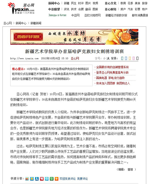【新闻报道】 亚心网讯(记者贺岩)10月15日,首届昌吉州木垒县哈萨克族妇女刺绣培训班开班仪式在新疆艺术学院举行。30名来自昌吉州木垒县的哈萨克族妇女在新疆艺术学院接受为期40天的刺绣培训。