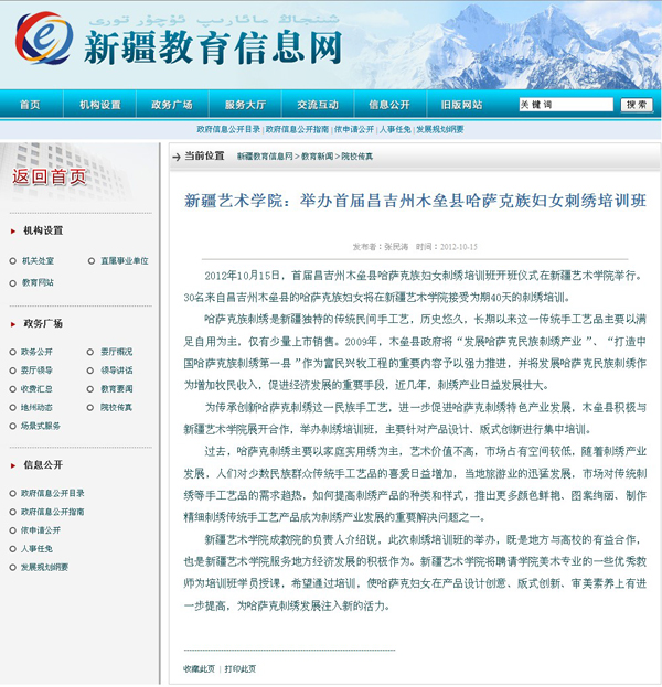 2012年10月15日教育信息网报道哈萨克刺绣班