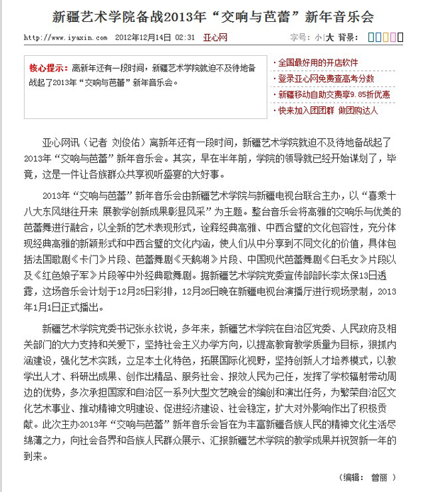 【新闻报道】 亚心网讯(记者刘俊佑)离新年还有一段时间,新疆艺术学院就迫不及待地备战起了2013年“交响与芭蕾”新年音乐会。其实,早在半年前,学院的领导就已经开始谋划了,毕竟,这是一件让各族群众共享视听盛宴的大好事。