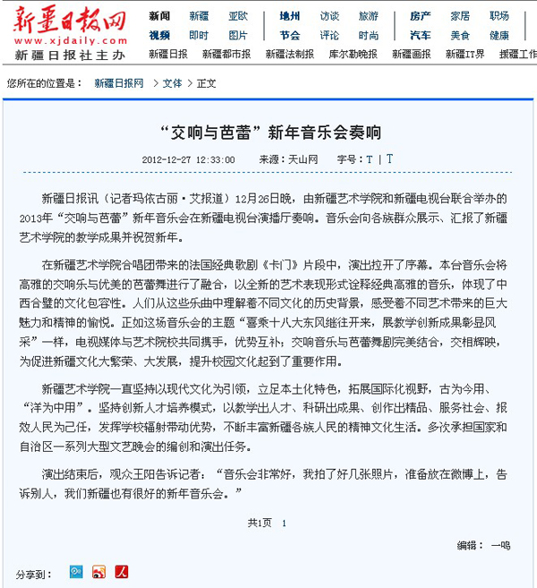 【新闻报道】 新疆日报讯(记者玛依古丽·艾报道)12月26日晚,由新疆艺术学院和新疆电视台联合举办的2013年“交响与芭蕾”新年音乐会在新疆电视台演播厅奏响。音乐会向各族群众展示、汇报了新疆艺术学院的教学成果并祝贺新年。