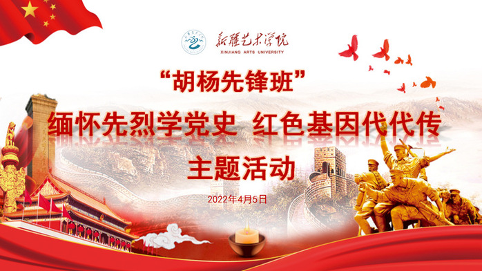 清明,是慎终追远、缅怀祖先的时节,也是重温历史、追忆英雄、弘扬精神的时节。4月5日,新疆艺术学院“胡杨先锋”优秀学生党员、入党积极分子培训班全体学员举行“缅怀先烈学党史,红色基因代代传”清明节主题宣讲活动。65位学员共分成八个小组,围绕活动主题,结合专业特点,用音乐、书法等形式一起缅怀那些为了民族兴亡、国家富强、社会安定,用鲜血和生命捍卫国家和人民利益的英雄们,通过讲述刘胡兰、董存瑞、杨靖宇、吉鸿昌、张桃芳、赵一曼、雷锋、拉齐尼•巴依克等英雄先烈故事的方式表达哀思和祭奠。之后全体学员同步登录中华英烈网,通过线上敬献花篮、发表感言寄语、参观网上陵园纪念馆、观看英雄先烈事迹等进行网上祭扫,向英烈寄托哀思、致敬缅怀,表达崇高的敬意。